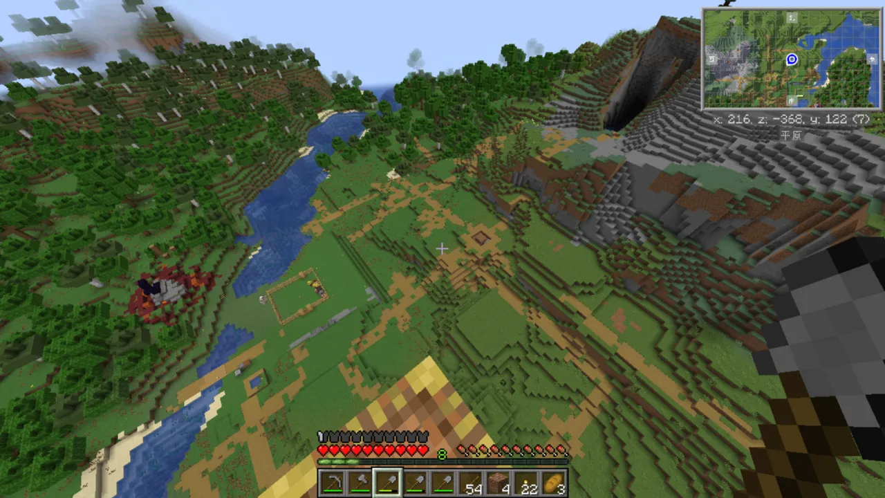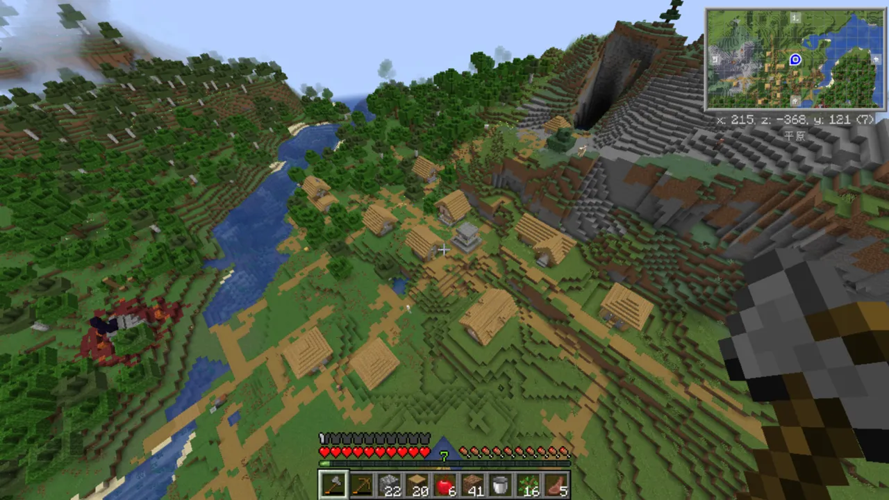 いい感じの出ないかな~と思って何度もワールド作成していたのですが、雪原に出たり砂漠に出たりメサに出たり踏んだり蹴ったり…平原はどこだああ!となっていたのですが、最後に出てきたワールドがすごかったのでちょっと自慢させてください。