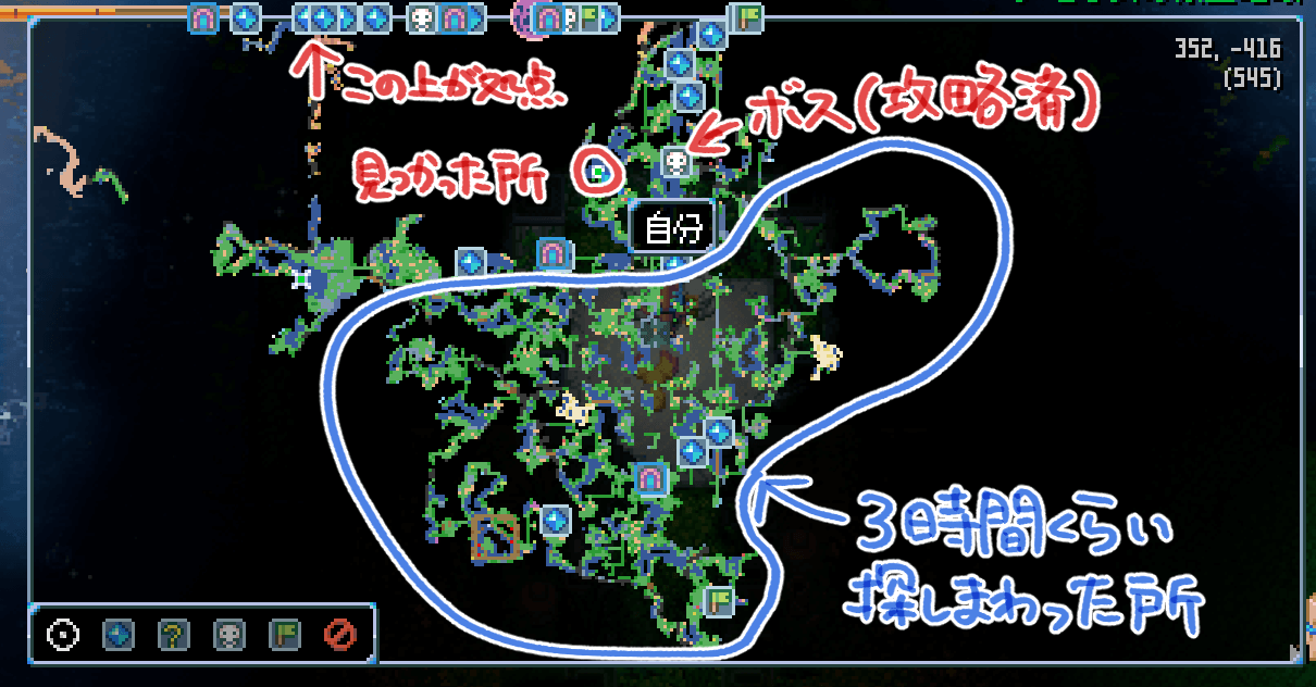 攻略したボスの奥側を3時間くらい探索しても小さい遺跡すら見つからず、なんでや💢と思ってボスから奥ではなく手前にちょっと掘ってみたら一発で見つかり、なんだか空しい気分になりました。