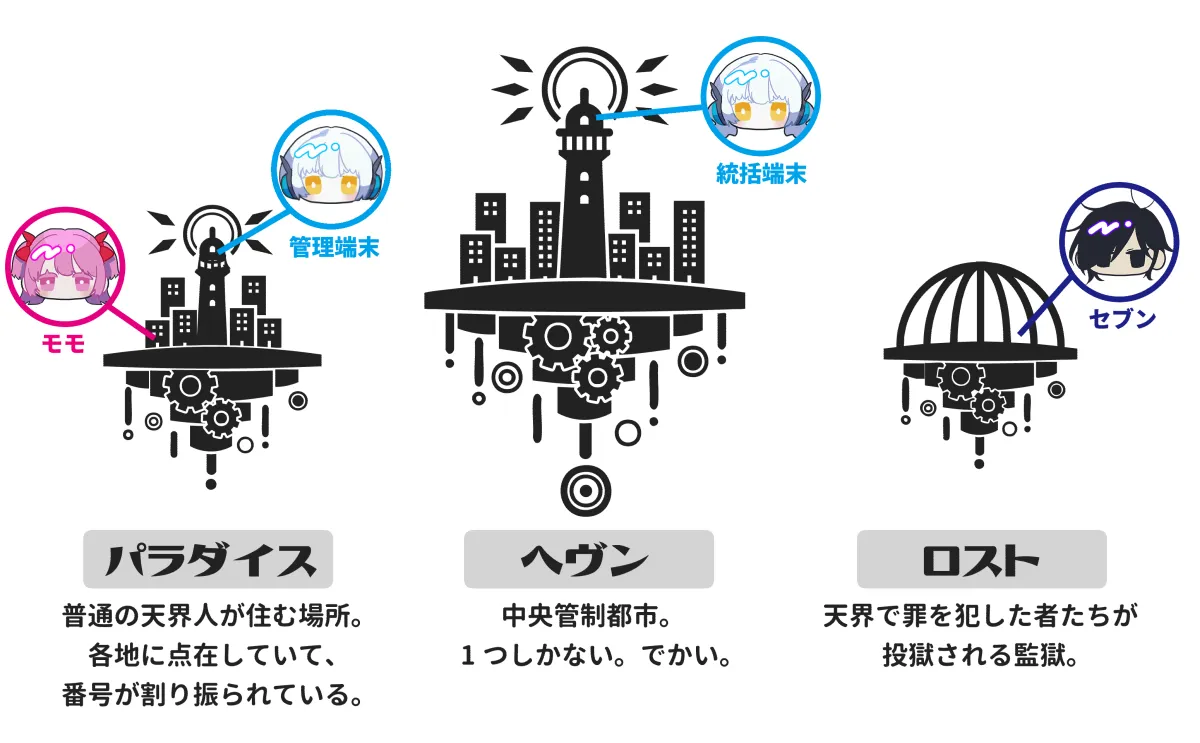 便宜上《天界》としているが、暮らしているのは浮遊都市に移住した人間たちの子孫であり、都市管理端末が《天使》と呼ばれているだけである。